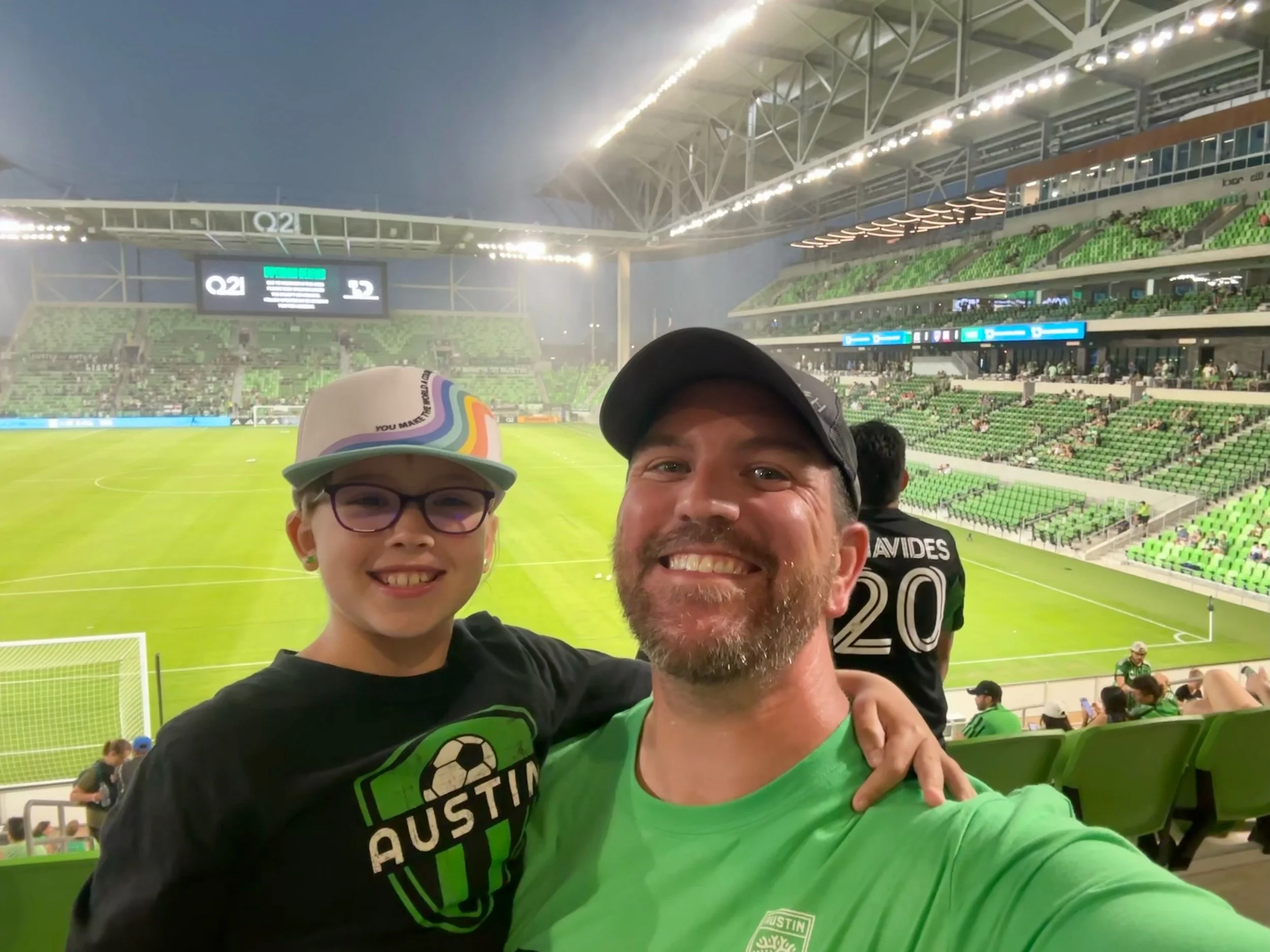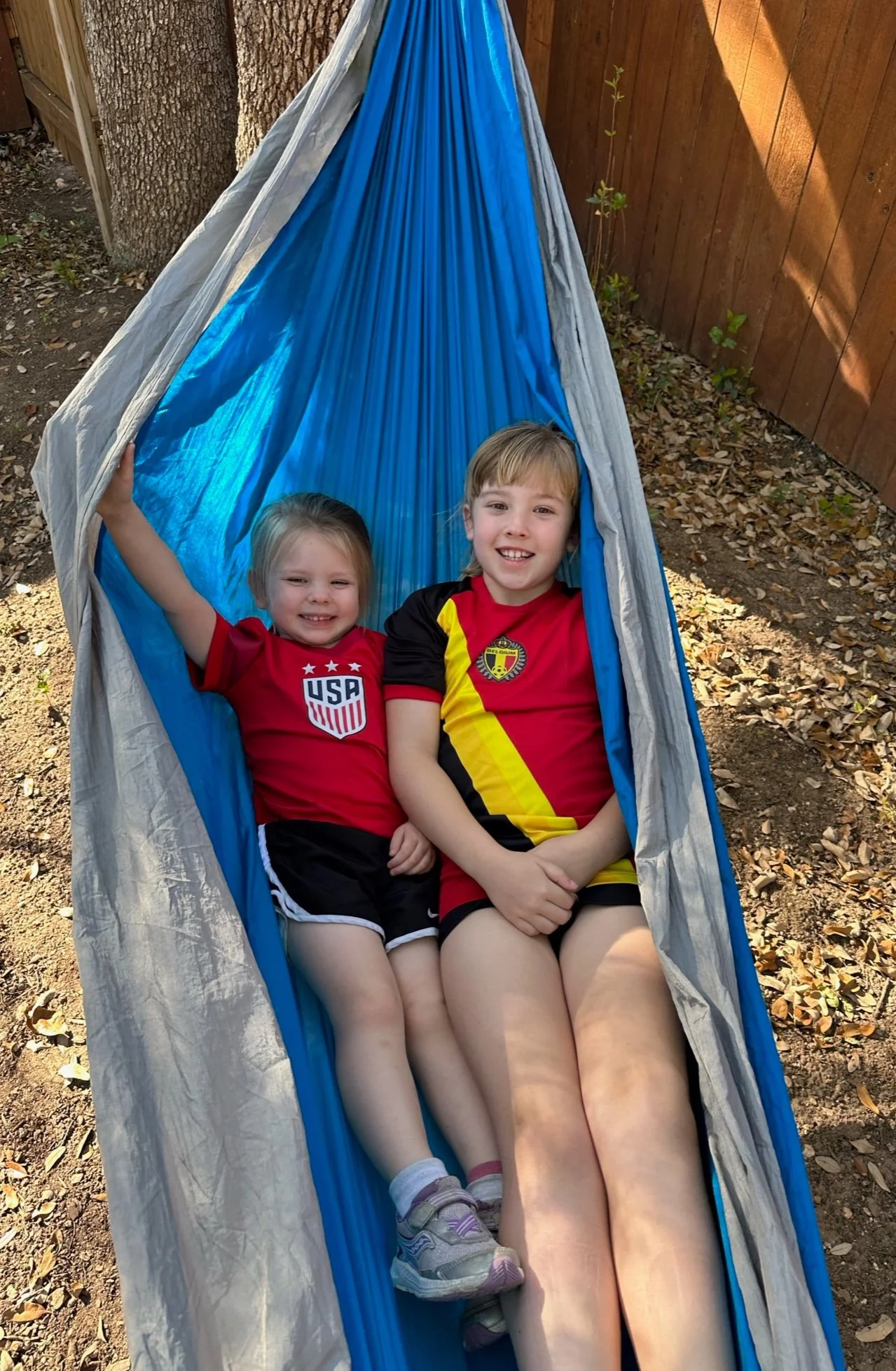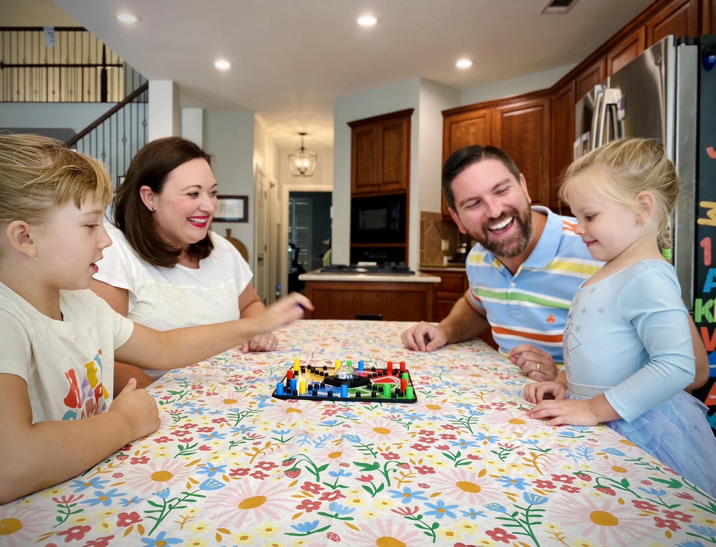 We live in Texas in a four-bedroom, three-and-a-half-bath home with an open floor plan and large backyard, which is great for parents vs. kids soccer games.